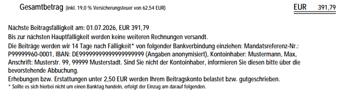 Die Beitragsrechnung berücksichtigt alle Änderungen des Vertrages, die Sie uns bis zum Ausstellungsdatum gemeldet haben und die von uns bereits dokumentiert wurden. Über rechtzeitig gemeldete, aber von uns nicht vor dem Ausstellungsdatum dokumentierte Änderungen erhalten Sie noch eine separate Mitteilung sowie automatisch eine neue Rechnung bis Mitte Januar 2026.