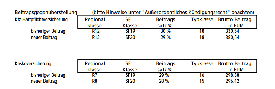 Die Beitragsgegenüberstellung zeigt Ihnen auf, ob sich der neue Beitrag (für 2026) gegenüber dem bisherigen Beitrag (für 2025) geändert hat. Ist der neue Beitrag höher als der bisherige, steht Ihnen ein außerordentliches Kündigungsrecht zu, es sei denn, die Erhöhung ist durch eine Rückstufung aufgrund eines Schadens oder durch die Änderung von Tarifmerkmalen bedingt. Kündigen Sie jedoch nicht voreilig. Informieren Sie sich bei uns, ob wir Ihnen einen günstigeren Versicherungsschutz anbieten können, z. B. durch eine Tarifänderung oder eine Änderung der Selbstbeteiligung in der Kaskoversicherung.